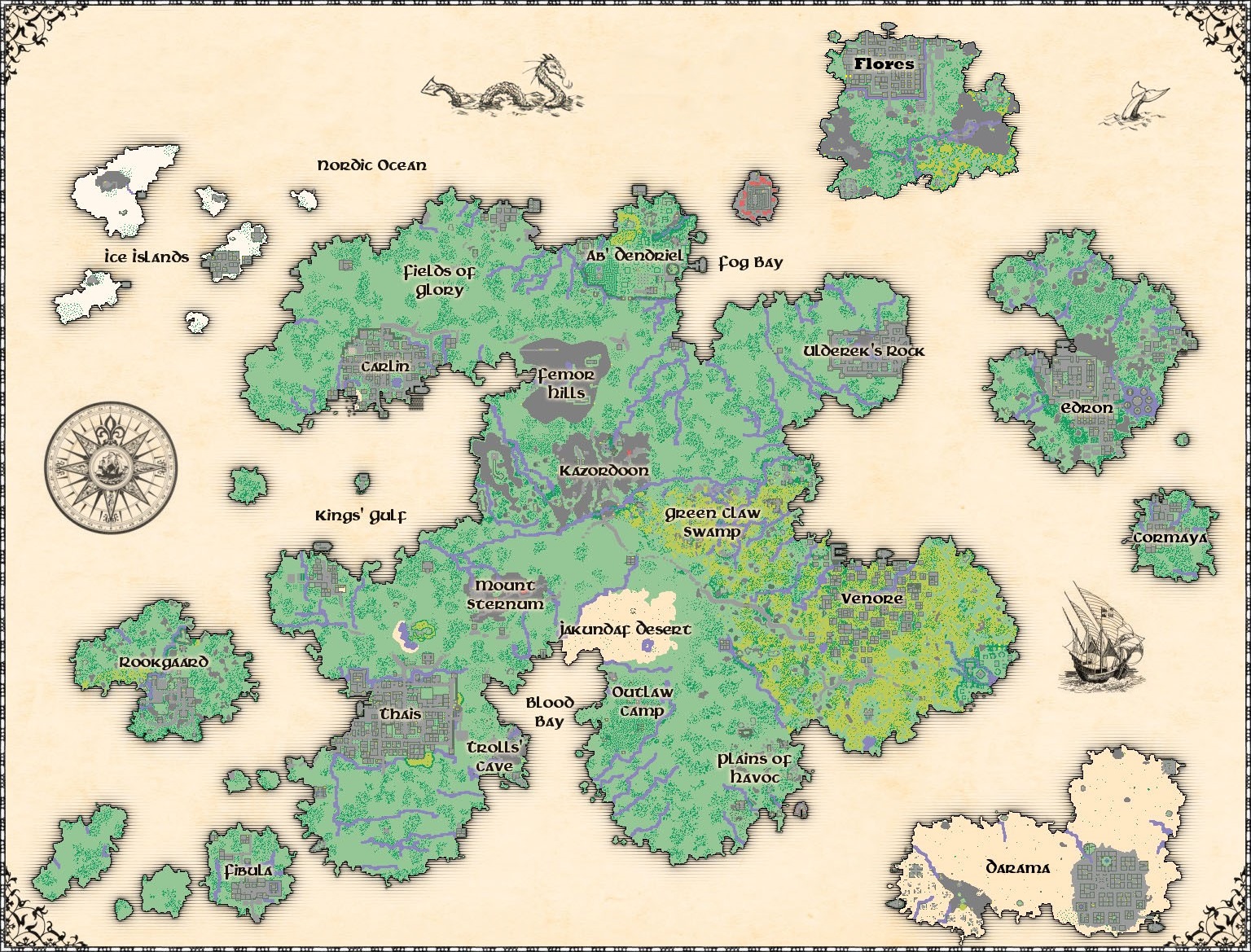Cities: Ab'Dendriel, Carlin, Kazordoon, Thais, Venore and Flores